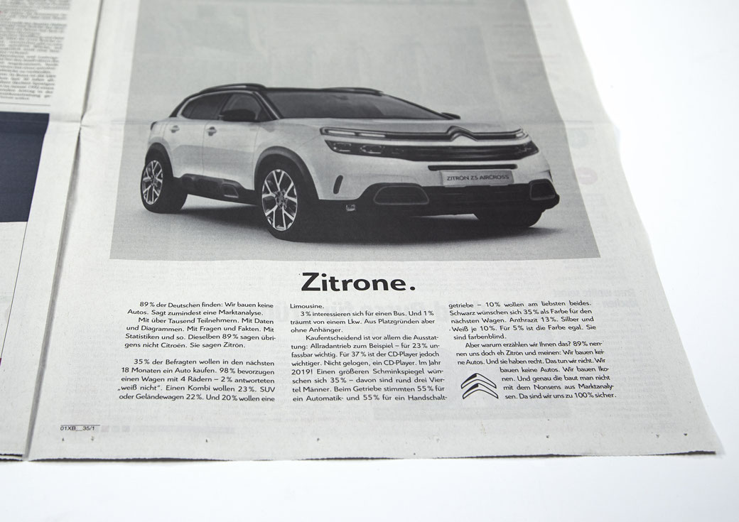 Wir entwickelten eine Longcopy-Anzeige in der Tradition der VW-Anzeige aus den 60er Jahren. Darin räumen wir mit Vorurteilen über die Marke Citroën auf – und demonstrierten mit Selbstbewusstsein und einem Augenzwinkern, dass Citroën schon immer anders war und andere Wege geht. Sogar in der Kommunikation.